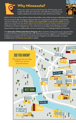 Why Minnesota? When you come curious to the University of Minnesota, you%u2019ll master the skills, learn the facts, and make the connections you need to explore the world, secure a job, and find your future. At the U of M, you will benefit from best-value tuition rates while earning a world-class education.We are proud to offer prestigious degrees that are recognized by employers and graduate schools worldwide. As one of the nation%u2019s top-ranked public research universities you will select your major from 150 of the nation%u2019s top academic programs, led by world-renowned professors to inspire and guide you. Our classrooms encourage critical thinking, provide opportunities to grow intellectually, and are trusted places to challenge beliefs and theories. The University of Minnesota Honors Program offers students exciting and unique opportunities as well as the chance to graduate with Latin distinction (summa, magna, or cum laude). Transfer students are accepted into the University Honors Program every fall semester on a space available basis. Visit honors.umn.edu for details. DID YOU KNOW?