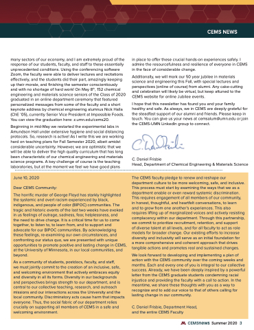 I hope that this newsletter has found you and your family healthy and safe. As always, we in CEMS are deeply grateful for the steadfast support of our alumni and friends. Please keep in touch. You can give us your news at cemsalum@umn.edu or join the CEMS-UMN LinkedIn group to connect.